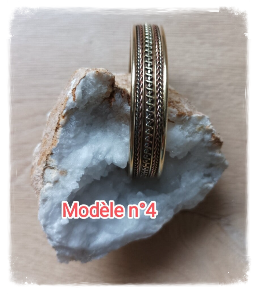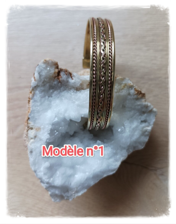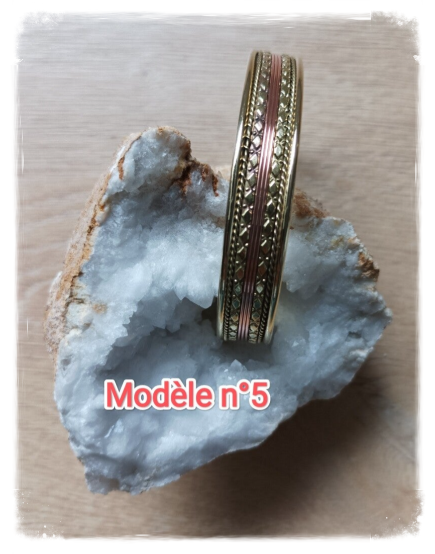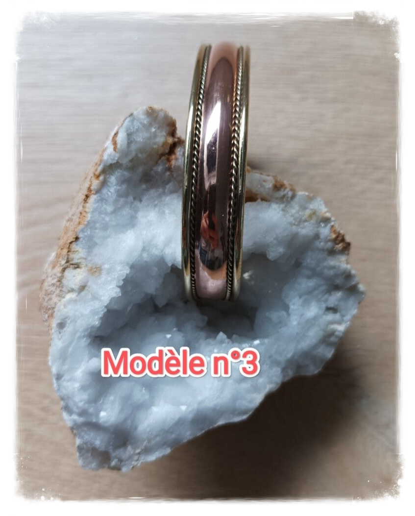Bracelet en cuivre couleur cuivre et or, réglable, différents motifs.