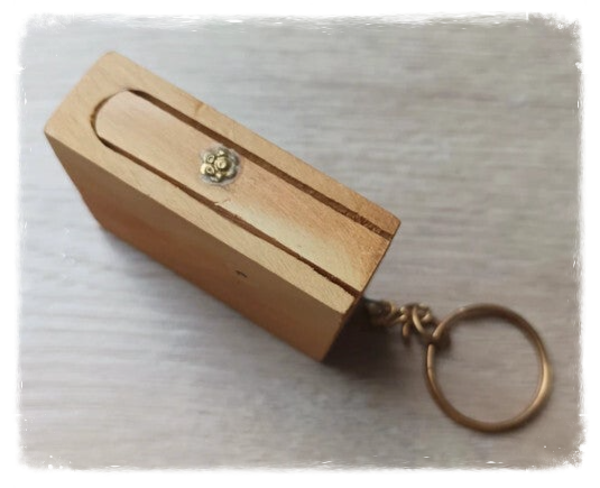 Porte-clés original avec une petite boite en bois dont un serpent jailli à l'ouverture.