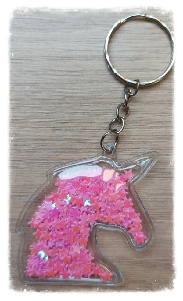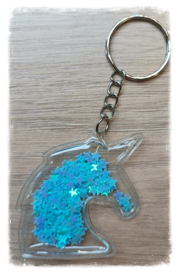 Joli porte-clés en forme de licorne transparent avec des étoiles colorées à l'intérieur à offrir à une personne fan de licornes ou pour se faire plaisir...