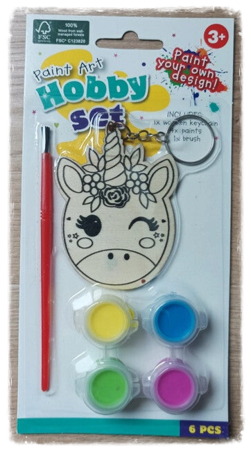 Ce petit kit comprend un porte-clés en bois, un assortiment de 4 couleurs de peinture et un pinceau. Le cadeau idéal pour les petits artistes en herbe.