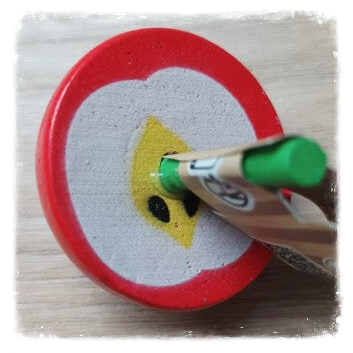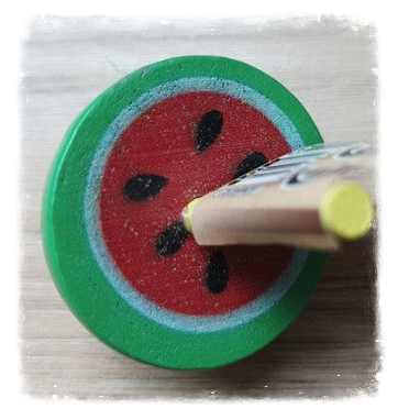 Ces petites toupies en bois sur le thème des fruits sont un défi pour la motricité des doigts.