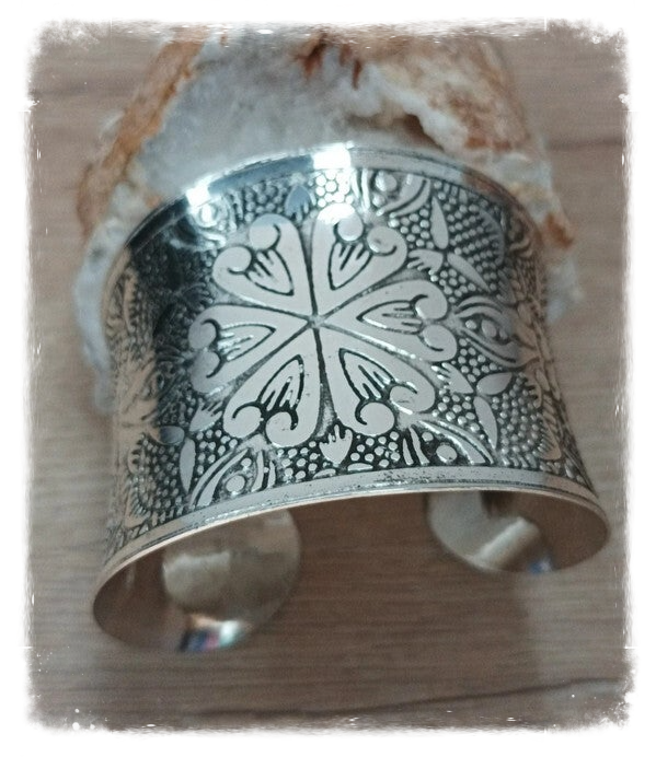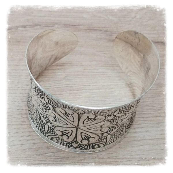 Joli bracelet en métal blanc ajustable avec motifs.
