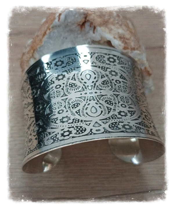 Joli bracelet en métal blanc ajustable avec motifs.
