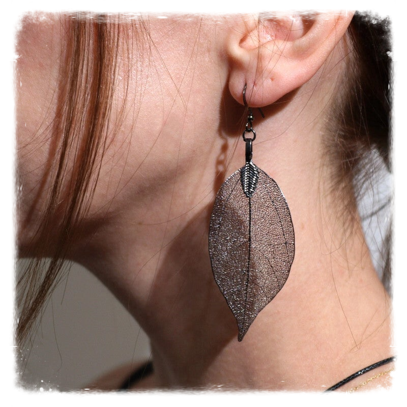 Set collier et boucles d'oreilles en véritables feuilles - Modèle Etain
