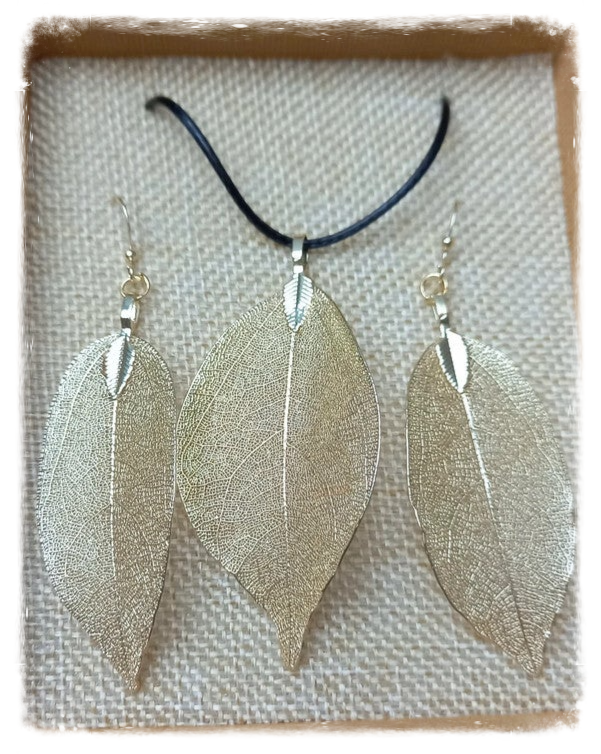 Set collier et boucles d'oreilles en véritables feuilles - Modèle or blanc