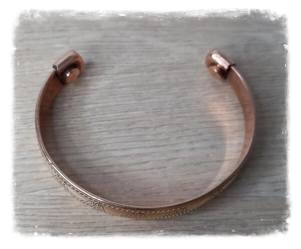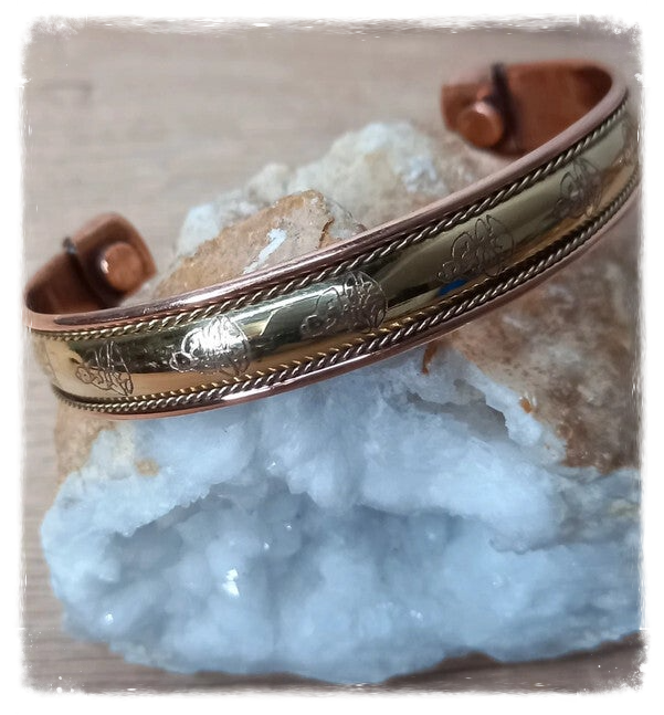 Bracelet magnétique en cuivre et avec un aimant à chaque extrémité permettant de bénéficier des bienfaits de la magnéto-thérapie, des propriétés anti-inflammatoire et anti-rhumatismales du cuivre.