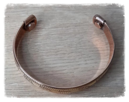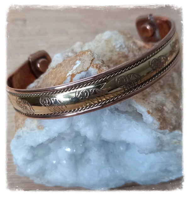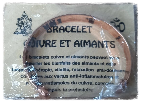 Bracelet magnétique en cuivre et avec un aimant à chaque extrémité permettant de bénéficier des bienfaits de la magnéto-thérapie, des propriétés anti-inflammatoire et anti-rhumatismales du cuivre.