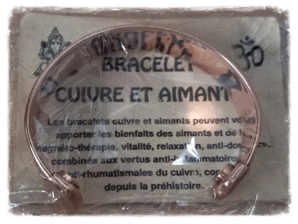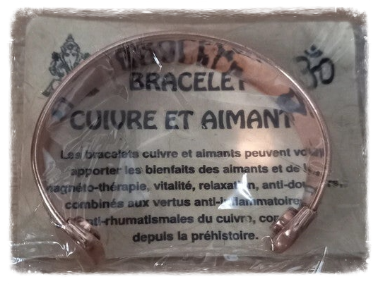 Bracelet magnétique en cuivre et avec un aimant à chaque extrémité permettant de bénéficier des bienfaits de la magnéto-thérapie, des propriétés anti-inflammatoire et anti-rhumatismales du cuivre.