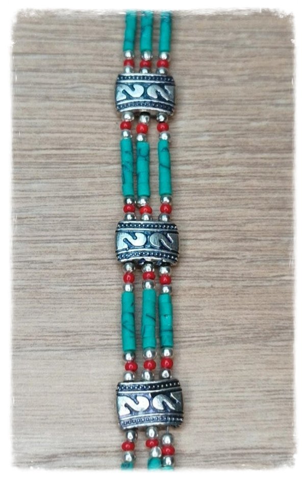 Très joli bracelet ethnique népalais composé de 3 rangs de perles en pierre et 5 plaques en métal argenté.