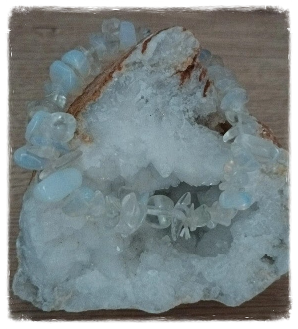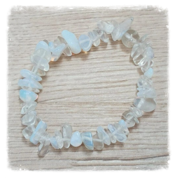 Elégant bracelet en éclats de pierres semi-précieuses, l'opalite est une pierre qui a plusieurs vertus :