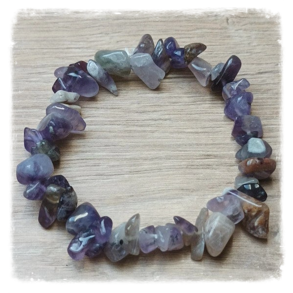Elégant bracelet en éclats de pierres semi-précieuses, l'améthyste est une pierre connue pour ses propriétés et vertus :