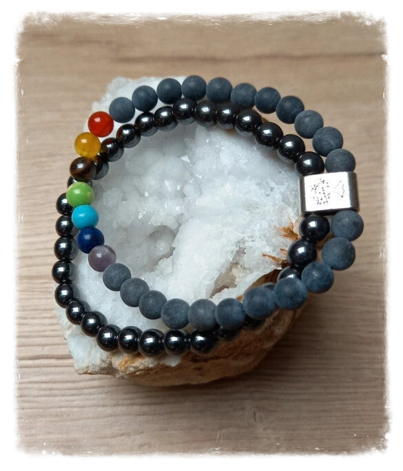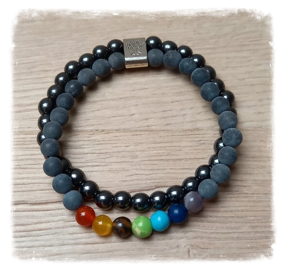 Le deuxième bracelet est en perles de pierre noire avec les 7 chakras qui possède également plusieurs vertus et bienfaits :