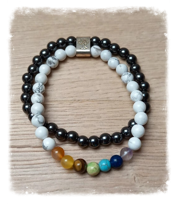 Le deuxième bracelet est en perles de Howlite blanche avec les 7 chakras qui possède également plusieurs vertus et bienfaits :