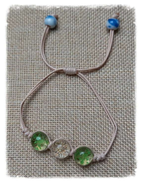 Bracelet 3 fleurs pressées sous verre - Vert et blanc