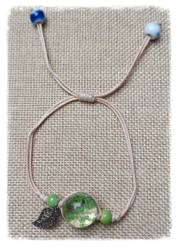 Bracelet fleur pressée sous verre et feuille métal - Vert