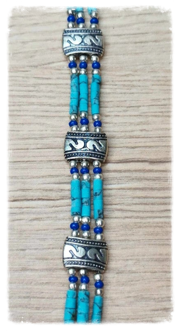 Très joli bracelet ethnique népalais composé de 3 rangs de perles en pierre et 5 plaques en métal argenté.