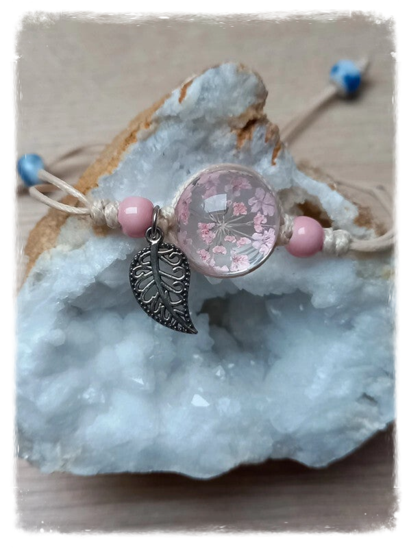 Joli bracelet en fleur pressée fabriqué avec des fleurs véritables pressées dans un morceau de verre.