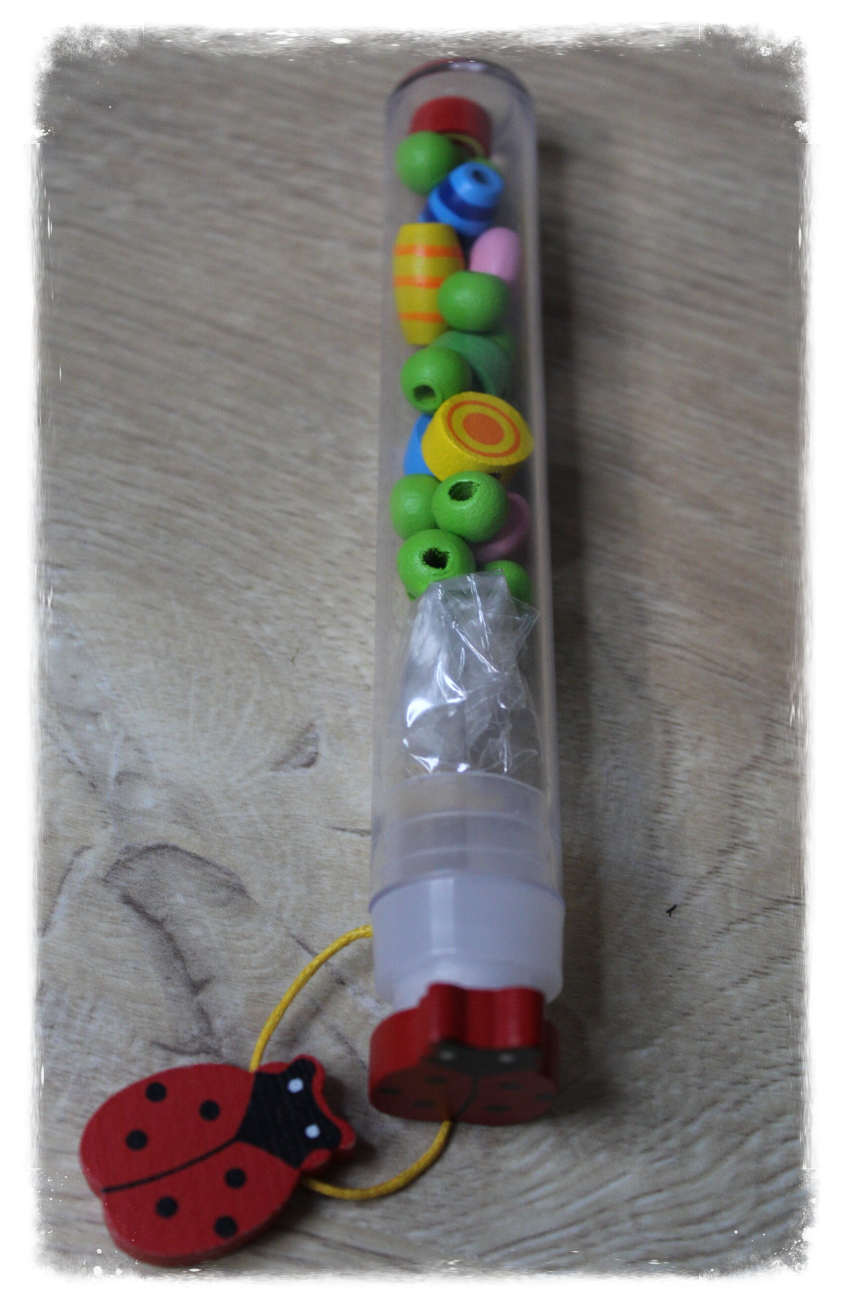 Tube avec perles en bois et ficelle pour créer un bracelet ou un collier.
