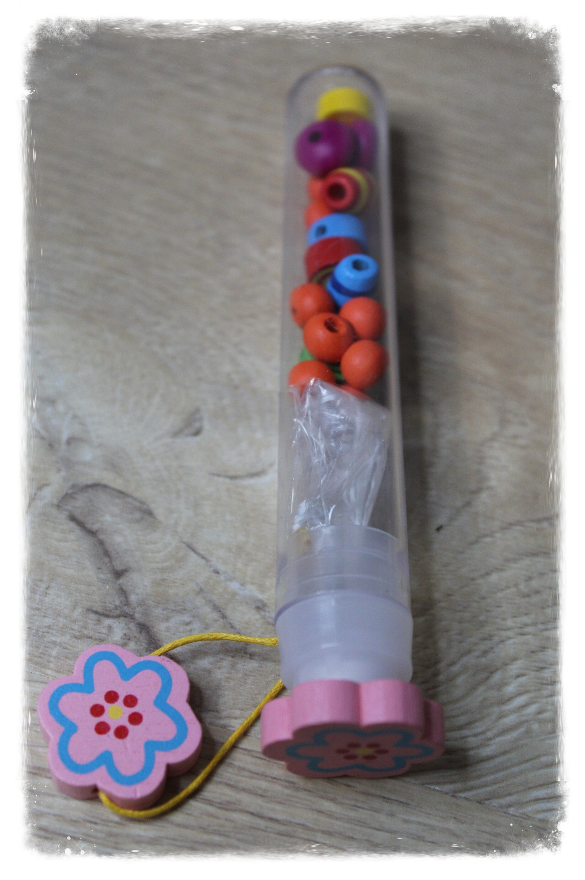 Tube avec perles en bois et ficelle pour créer un bracelet ou un collier.