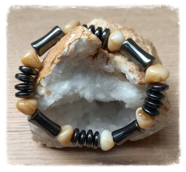 Ce bracelet est fabriqué à partir de perles d'hématite, un minéral naturellement magnétique qui possède de nombreuses vertus :