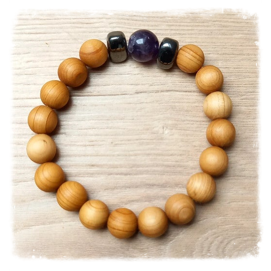 Fabriqué à partir de cèdre naturel et d'améthyste, ce bracelet est idéal pour les personnes cherchant à renforcer leur clairvoyance et leur compréhension spirituelle.