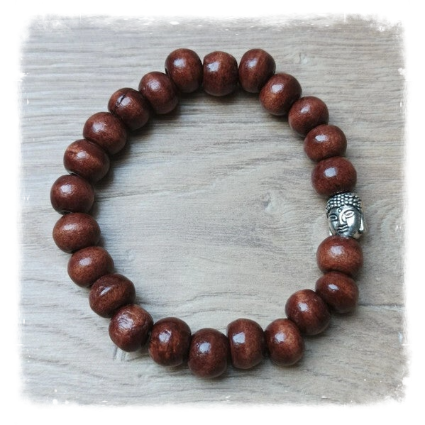 Ce bracelet Bouddha en perles a été fabriqué à partir de perles de bois naturel et incluant une perle en métal représentant la tête de Bouddha qui est un symbole fort dans le bouddhisme, incarnant la sagesse, la connaissance et une profonde compréhension de la vie et de l'univers.