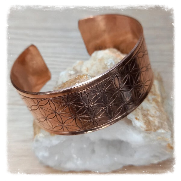 Ce bracelet tibétain en cuivre dévoile la géométrie sacrée de la Fleur de Vie, symbole universel de perfection.
