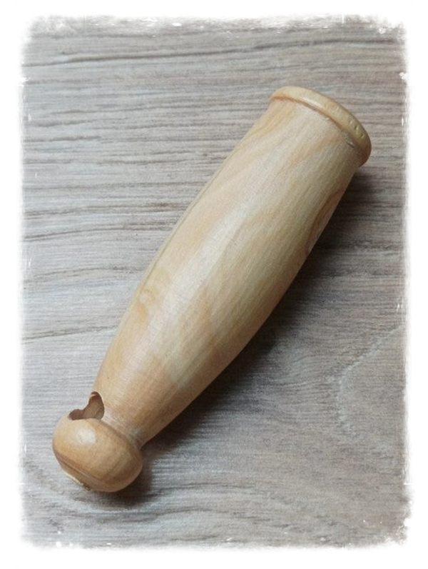 En bois de buis local verni, ce sifflet 100% naturel projette un son très net et puissant.