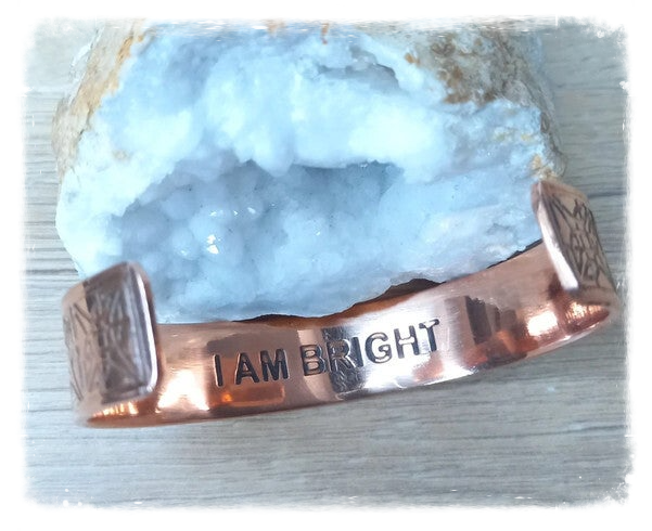 Bracelet en cuivre massif gravé d’une affirmation positive " I am bright " ( Je suis brillant ) .