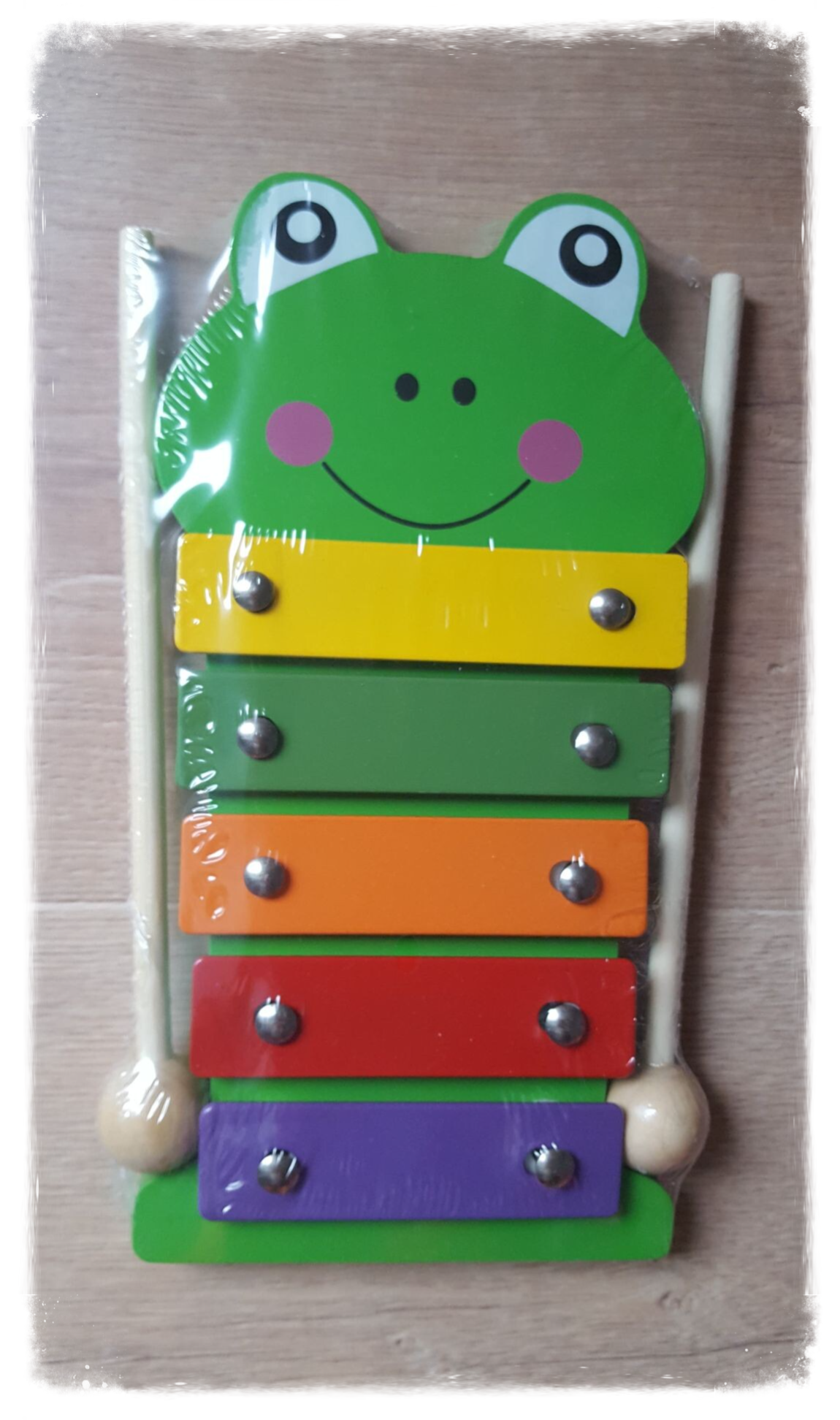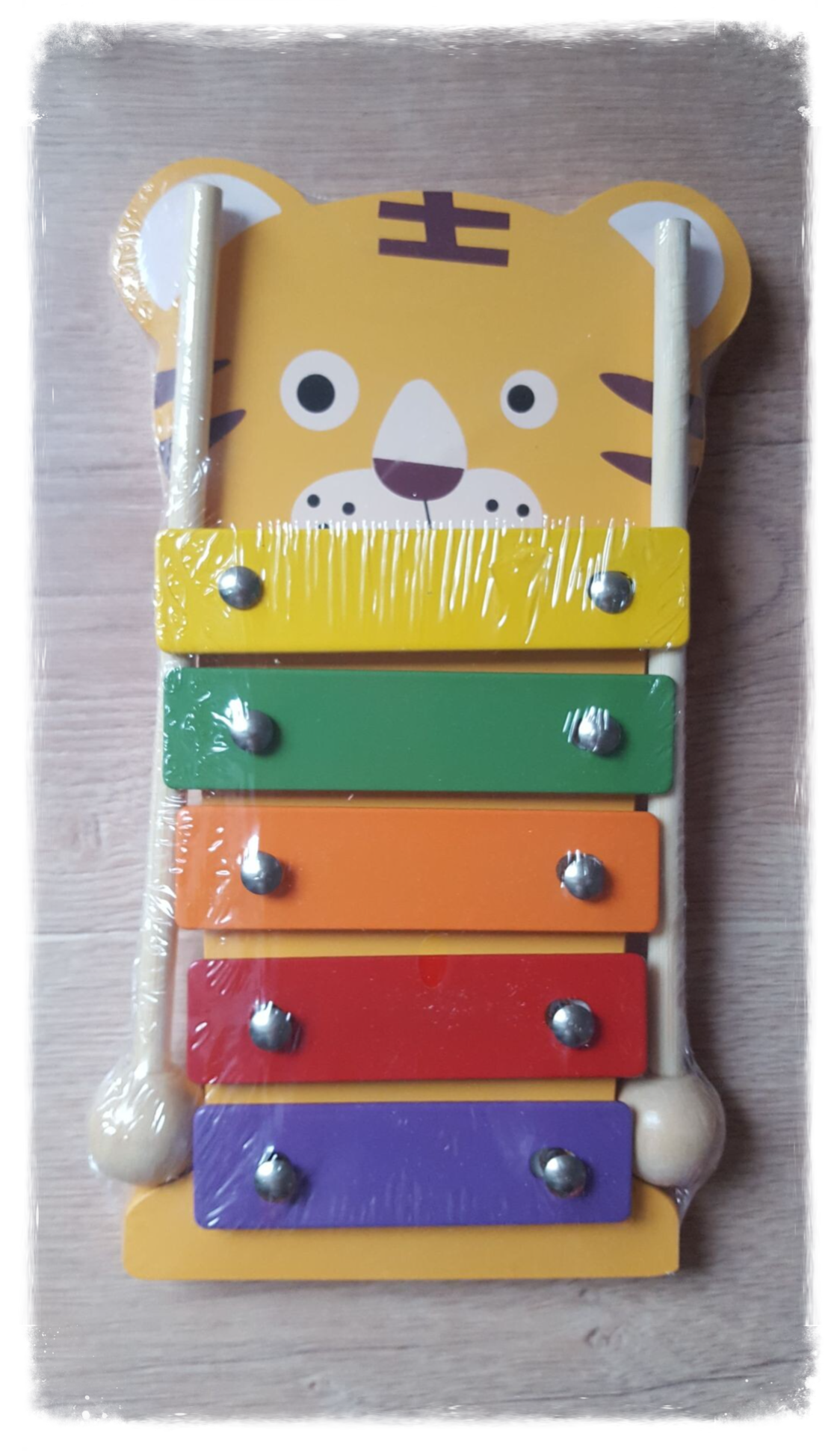 Un joli xylophone coloré en bois et en métal sur le thème des animaux.