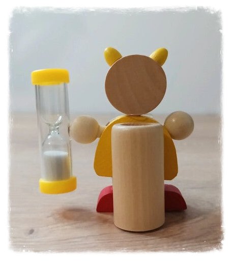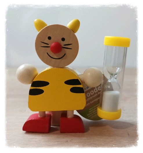 Porte brosse à dents en bois et sablier, pour apprendre à se brosser les dents le temps nécessaire.